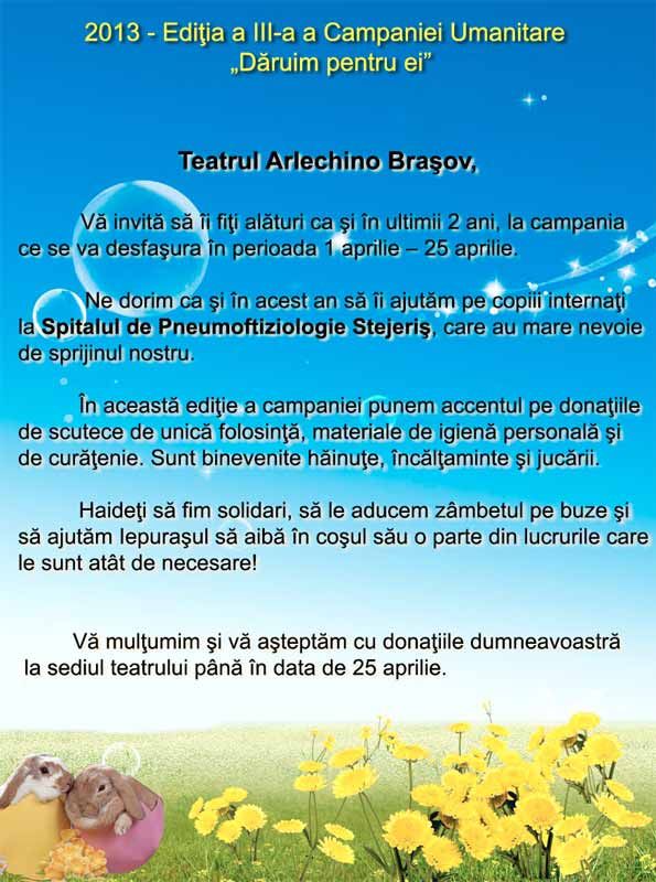 Teatrul Arlechino Braşov, vă invită să îi fiţi alături ca şi în ultimii 2 ani, la campania ce se va desfaşura în perioada 1 aprilie – 25 aprilie a.c.