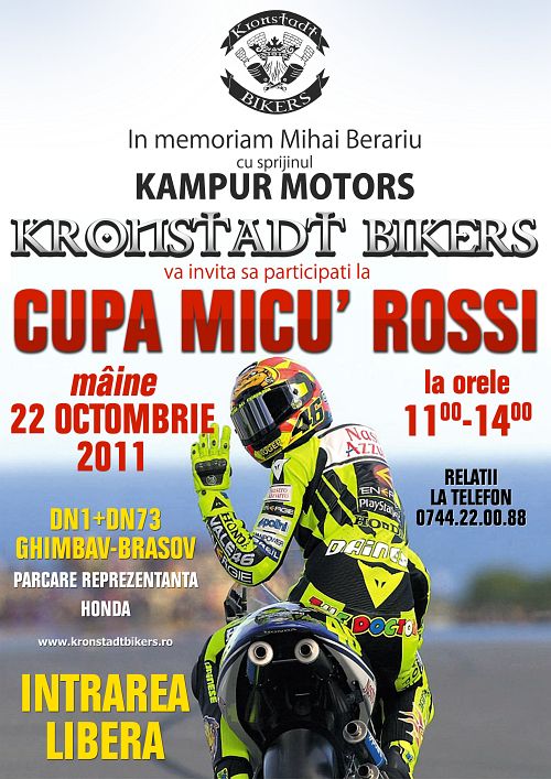 KRONSTADT BIKERS in memoriam Mihai Berariu invita toti iubitorii genului moto sa participe la Cupa micu' Rossi. Cu aceasta ocazie vor avea loc concursuri si alte lucruri specifice.