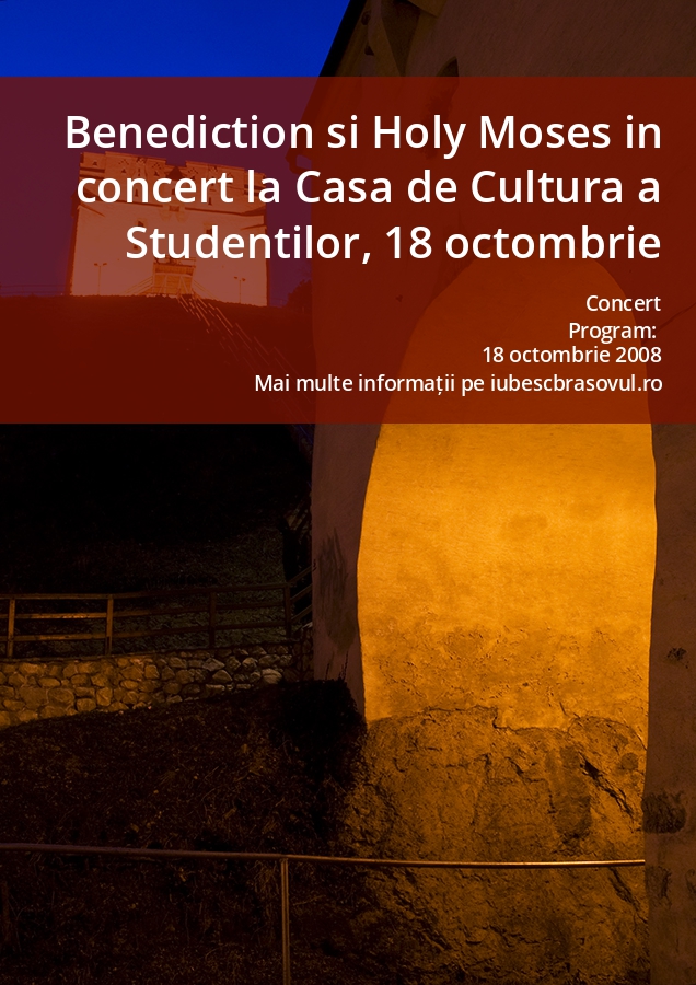 Bangyourbrain ne invita pe data de 18 octombrie 2008 la un concert extraordinar unde invitati vor fi doi monstrii sacrii ai muzicii extreme: Benediction si Holy Moses. Evenimentul va avea loc la Sala Casei de Cultura a Studentilor Brasov situate pe strada Memorandului incepand cu orele 19.30. Cele doua trupe se vor afla in turneu european si Sambata, 18 Octombrie 2008, vor poposi in Brasov pentru a-si promova noile albume respectiv Killing Music - Benediction si Agony Of Death - Holy Moses. Pe langa cele doua trupe vor mai urca pe scena trupa suedeza Nominon si clujenii de la Truda, care, la randul lor vor fi intr-o plimbare prin tara pentru promovarea noului lor album. Biletele pentru acest eveniment vor costa 45 de lei si vor fi disponibile incepand cu data de 10 Septembrie. Numarul de bilete este limitat la 500. Biletele se pot cumpara de la staff-ul Bangyourbrain astfel: