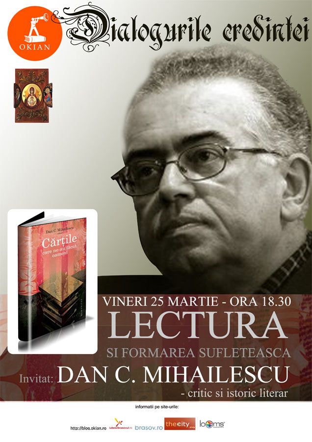 Libraria Okian gazduieste intalnirea periodica "Dialogurile credintei" cu tema lectura si formarea sufleteasca, marti, 25 martie, ora 18:30, cu invitatul special Dan.C. Mihailescu – critic si istoric literar.