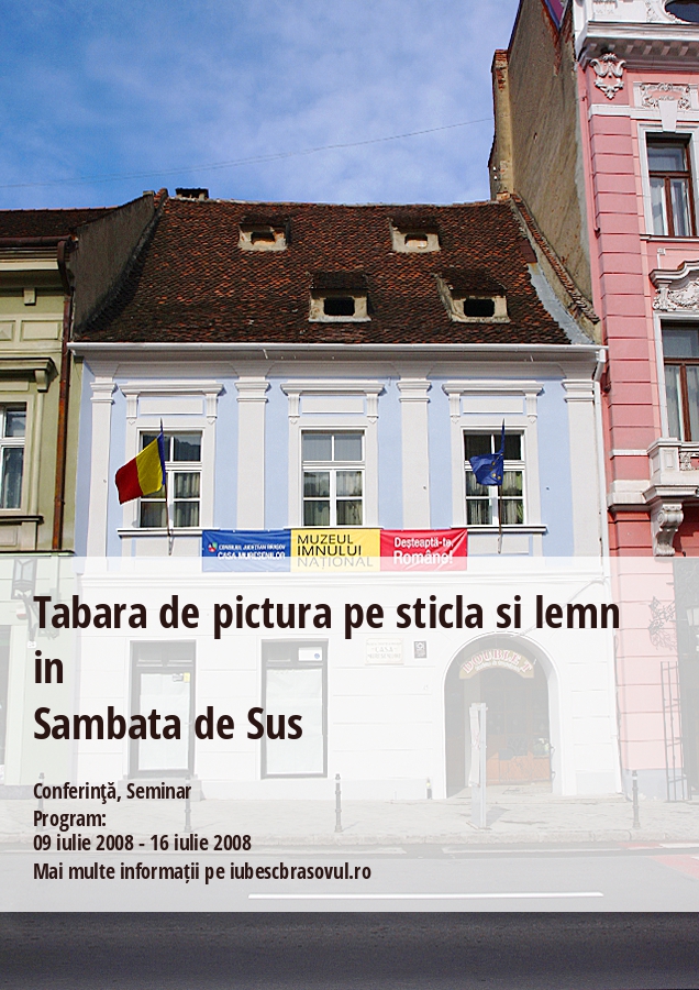 Consiliul Judeţean Braşov, Centrul Judeţean pentru Conservarea şi Promovarea Culturii Tradiţionale Braşov în parteneriat cu Mănăstirea Brâncoveanu, Sâmbăta de Sus, vă invită miercuri, 09.07.2008 , la festivitatea de deschiderea „Taberei de pictură pe sticlă şi lemn" de la Mănăstirea Brâncoveanu, Sâmbăta de Sus. În perioada 9-16 iulie 2008, CJCPCT Braşov va organiza prima ediţie a taberei de pictură pe sticlă şi lemn pentru copiii talentaţi care, sub îndrumarea profesorilor au început să practice pictura religioasă pe sticlă şi pe lemn.
