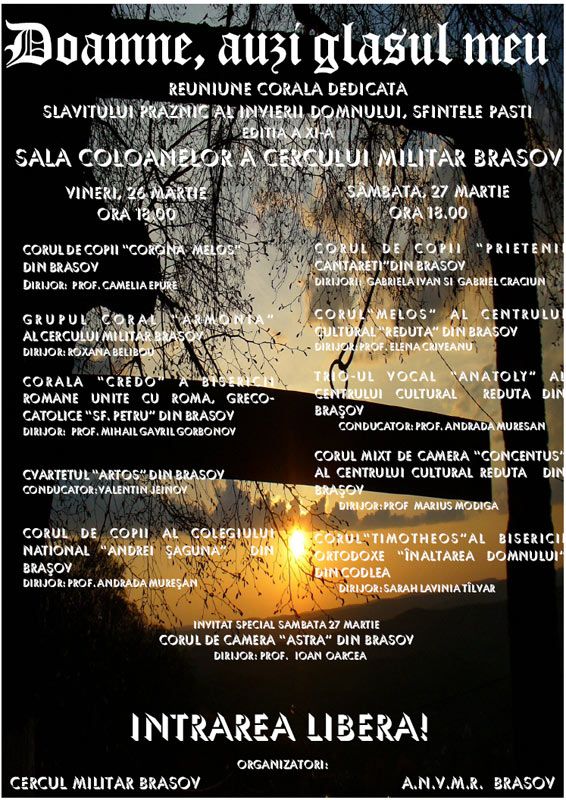 La manifestare participa coruri ale bisericilor din Brasov si imprejurimi, formatii ale Centrului Cultural Reduta si Cercului Militar Brasov.